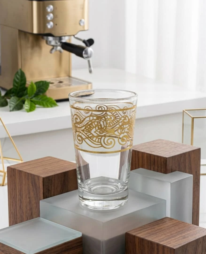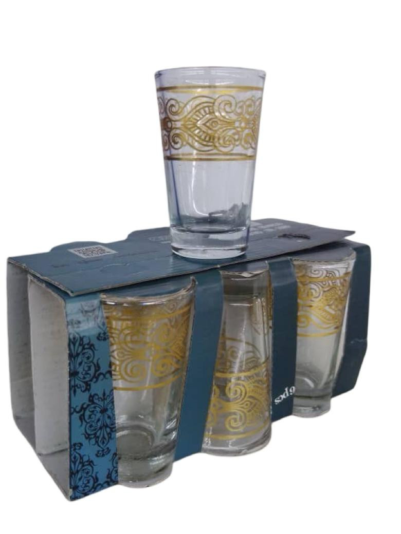 طقم أنيق من كاسات الزجاج الشفاف مزين بنقوش ذهبية فاخرة تضيف لمسة راقية إلى مائدة التقديم. يتميز بتصميم عملي ومناسب لتقديم الشاي، القهوة العربية، العصائر، أو المشروبات الباردة. يأتي داخل علبة مرتبة للحفظ والعرض، مما يجعله خيارًا مثاليًا للاستخدام اليومي أو كهدية مميزة للمناسبات.