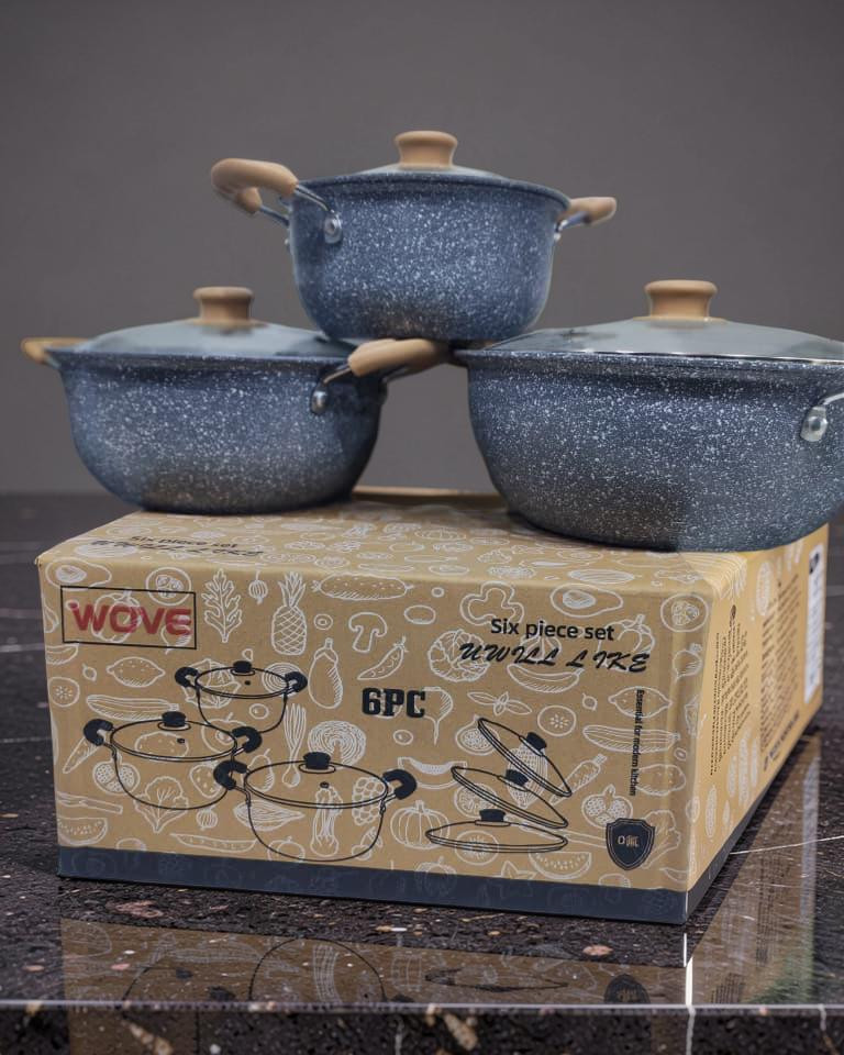طقم قدور عملي وأنيق من ماركة Wave مصنوع من الجرانيت عالي الجودة بسطح مقاوم للالتصاق، يساعد على الطهي الصحي باستخدام كمية أقل من الزيت. يتميز بتصميم عصري باللون الرمادي المنقط مع مقابض مريحة مقاومة للحرارة، وأغطية زجاج شفافة لمراقبة الطعام أثناء الطهي.