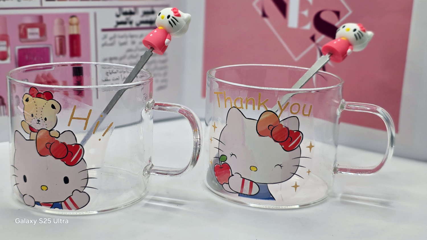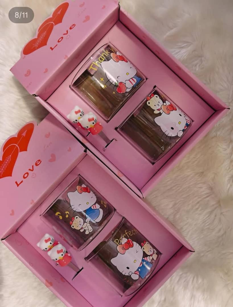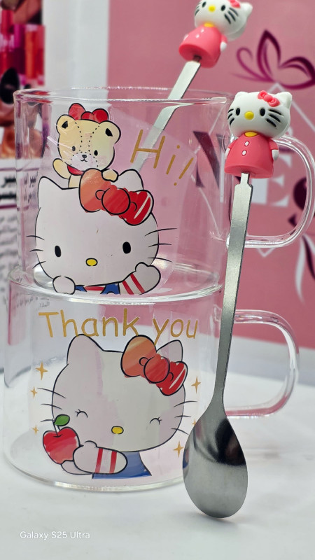 طـقم مـتكامل يـأتي فـي بـوكس يحتوي عـلى كـوبين مـن الـزجاج الـفاخر مـع مـلاعق كـيتي الـلطيفة