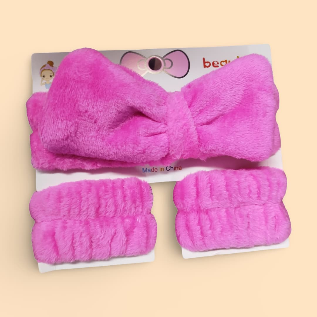 طقم عملي وأنيق مخصص للعناية بالبشرة والمكياج، يتكوّن من رباط رأس ناعم مزخرف بفيونكة أو زهور، بالإضافة إلى زوج من أربطة المعصم لامتصاص الماء. مصنوع من قماش مخملي فائق النعومة ومريح على البشرة، يساعد على تثبيت الشعر بعيدًا عن الوجه أثناء غسل الوجه، وضع المكياج، أو تطبيق الماسكات