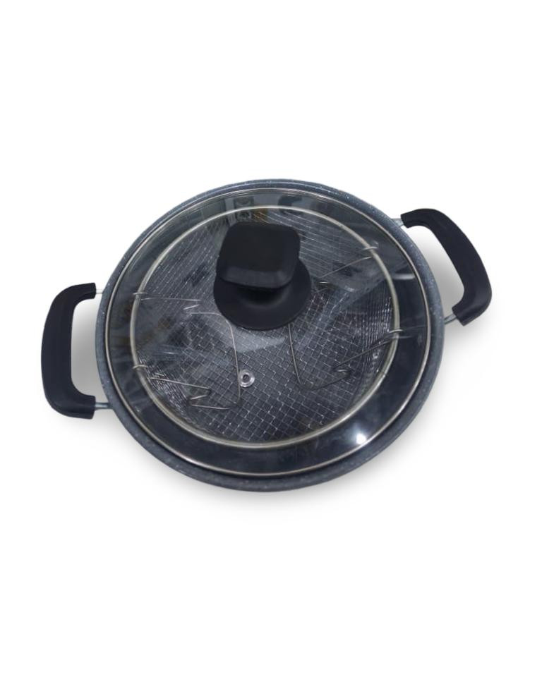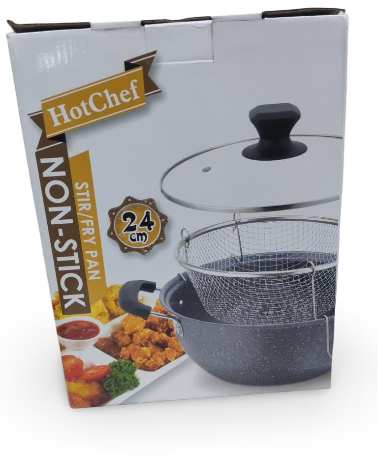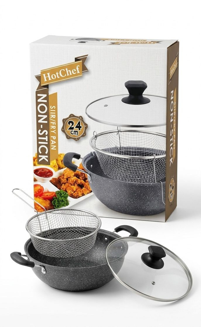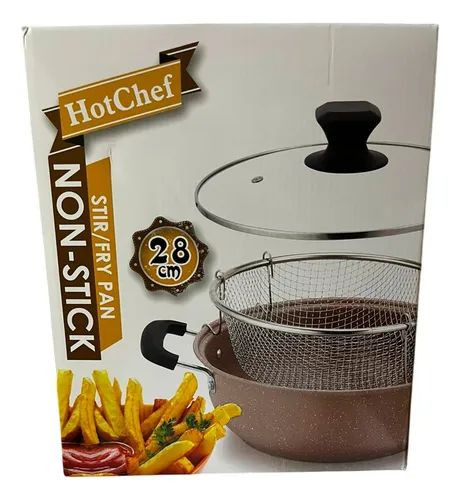 مقلاة متعددة الاستخدامات من HotChef، مصنوعة بطبقة غير لاصقة عالية الجودة لتسهيل الطهي والتنظيف. تأتي مع سلة شبكية للقلي وغطاء زجاجي مقاوم للحرارة لمراقبة الطعام أثناء الطهي. مناسبة للقلي، التشويح (Stir Fry)، وتحضير مختلف الأطباق، وتتميز بمقابض مريحة وآمنة للاستخدام اليومي في المطبخ.