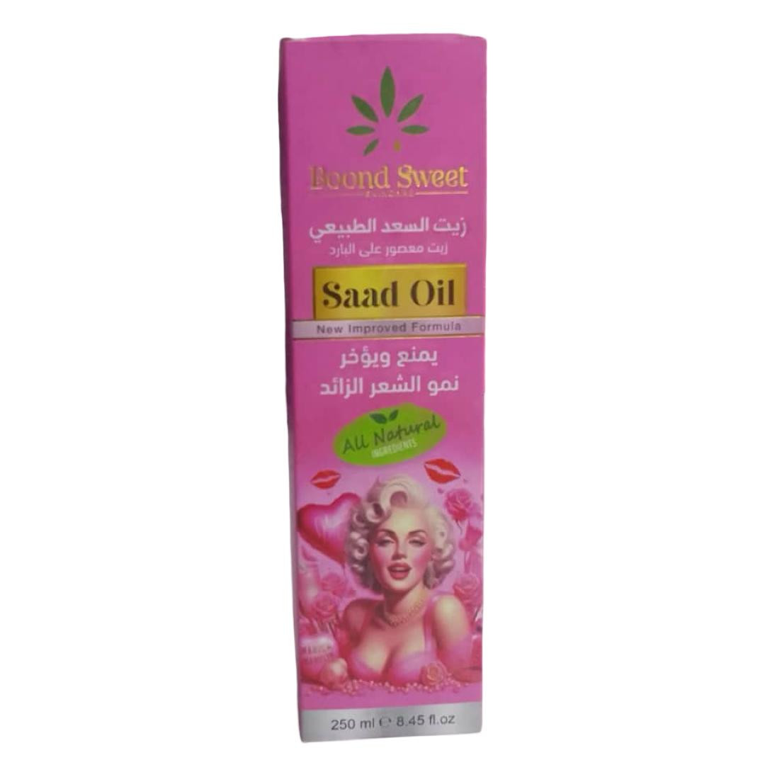 زيت السعد هو منتج للعناية بالبشرة يستخدم للمساعدة في منع وتأثير نمو الشعر الزائد. يحتوي على مكونات طبيعية بالكامل ويأتي بتركيبة محينة (New Improved Formula). يوجد نوعان من العبوات في الصورة، واحدة مع عبوة بيضاء والأخرى مع عبوة وردية.