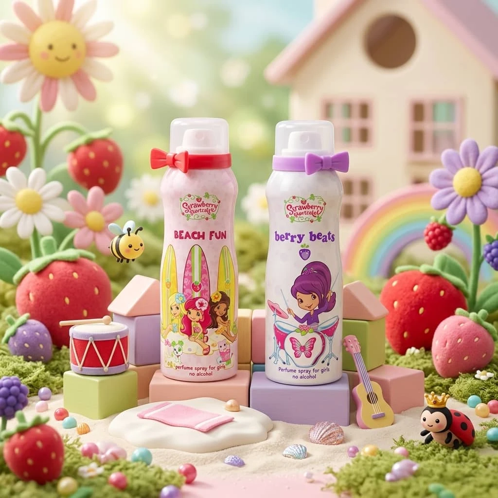عطر للأطفال مستوحى من شخصيات Strawberry Shortcake، بتصميم مرح بطابع الشاطئ مع ألوان زاهية ولوح تزلج أصفر. يأتي برائحة فاكهية لطيفة، ومناسب للاستخدام اليومي للأطفال. خالٍ من الكحول، وآمن على البشرة، في عبوة جذابة مع رباط للزينة
