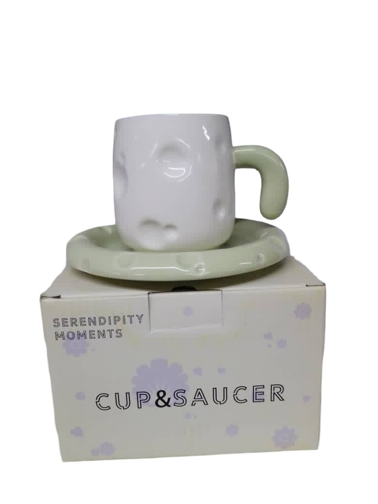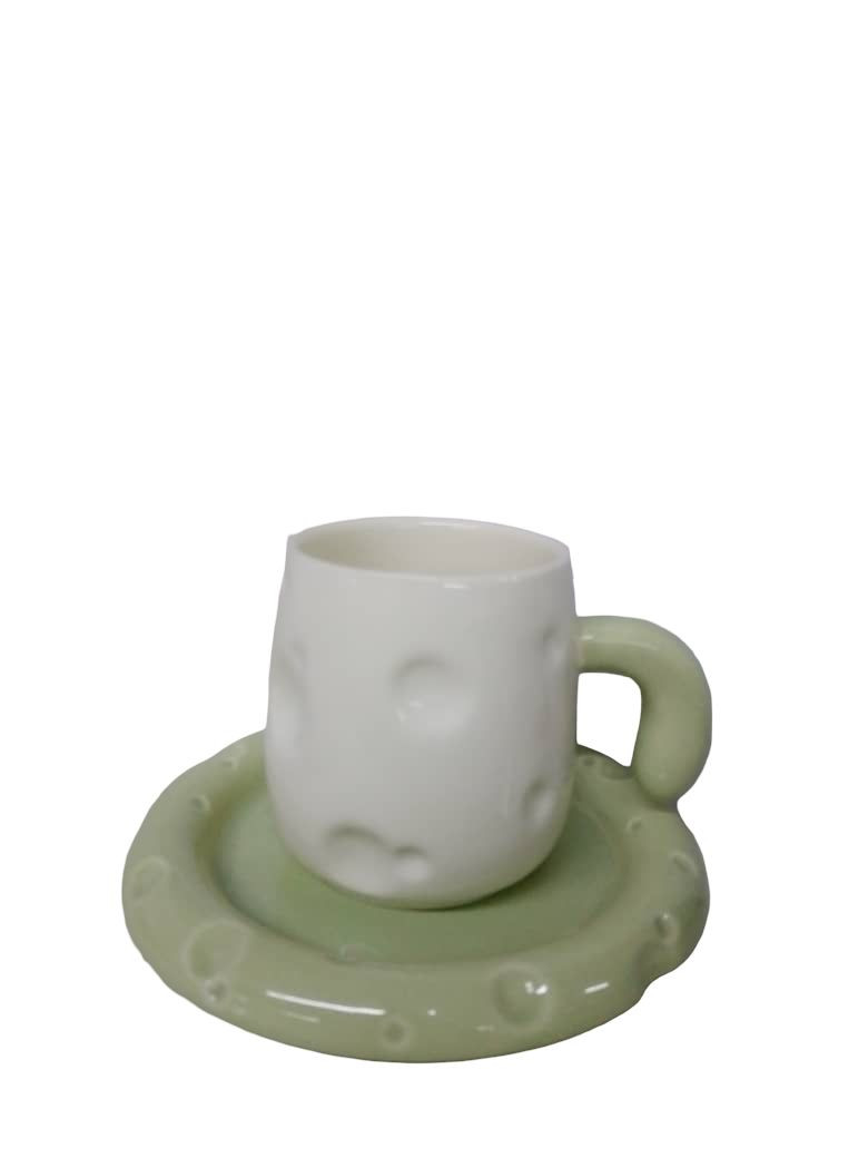 أكواب قهوة فريدة من نوعها مصممة على شكل أكواب ذات مقابض مستوحاة من شكل الجبن، مع صحن متماثل يتناسب مع الأكواب. الأكواب مصنوعة من السيراميك الأبيض الذي يتميز بملمس يشبه الجبن، حيث تحتوي على تفاصيل تجسيدية مثل الثقوب التي تعكس مظهر الجبن. يأتي المنتج في لونين، الأول بني مع صحن بني فاتح، والثاني أخضر مع صحن أخضر فاتح. هذه الأكواب تضيف لمسة من المرح والتصميم العصري على أي مجموعة أكواب، وهي مثالية لمحبي التميز والأشكال الغريبة.