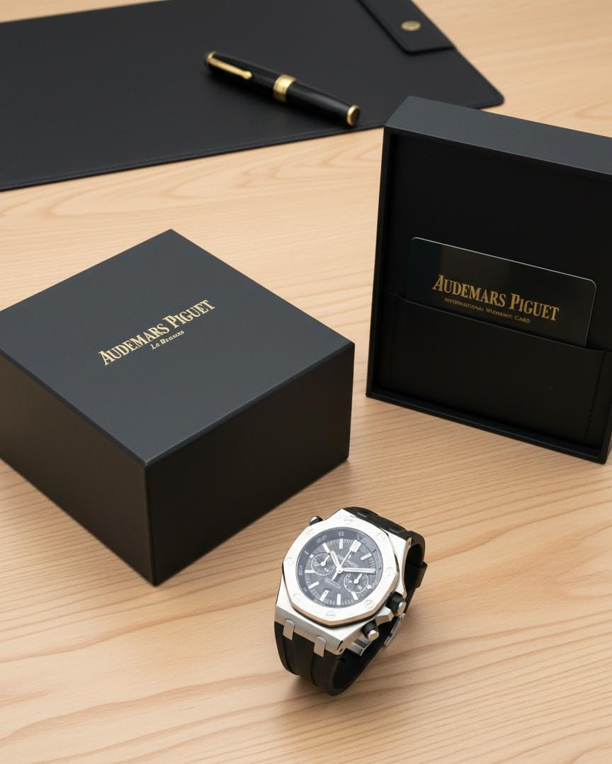 علبة Audemars Piguet الأصلية الفاخرة مع بطاقة الضمان، جاهزة للإهداء.