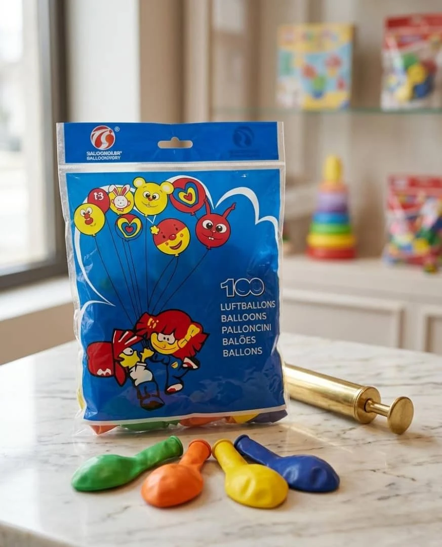 يتضمن هذا المنتج حقيبة تحتوي على مجموعة من البالونات بألوان متنوعة (أحمر، أخضر، أزرق، أصفر، برتقالي، وردي، وغيرها). يتم تصنيعها من اللاتكس الطبيعي، وتستخدم للاحتفالات، الحفلات، أو أي مناسبة أخرى تتطلب تزيين باستخدام البالونات. على الحقيبة توجد تحذيرات تتعلق بالأطفال تحت سن 8 سنوات وتفاصيل حول كيفية التعامل مع البالونات بشكل آمن.