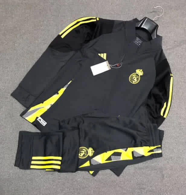 طقم رياضي رجالي فاخر بتصميم عصري يجمع بين الأناقة والهوية الرياضية، مخصص لعشاق نادي ريال مدريد. يتكون من سترة بسحاب كامل وسروال متناسق، بلون أسود أنيق مع لمسات صفراء جريئة تضفي طابعاً مميزاً.