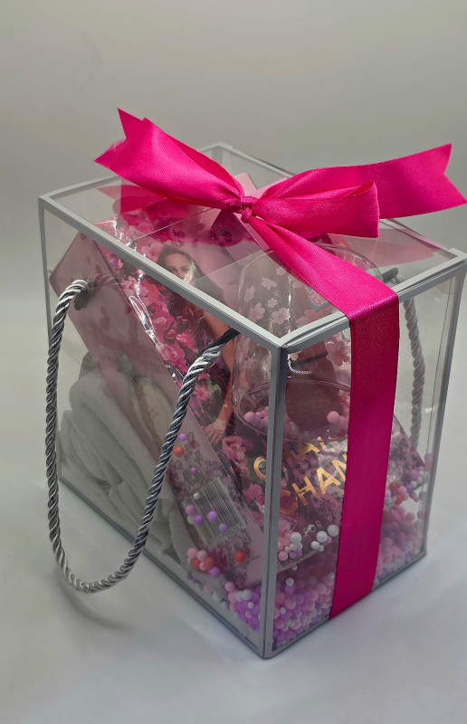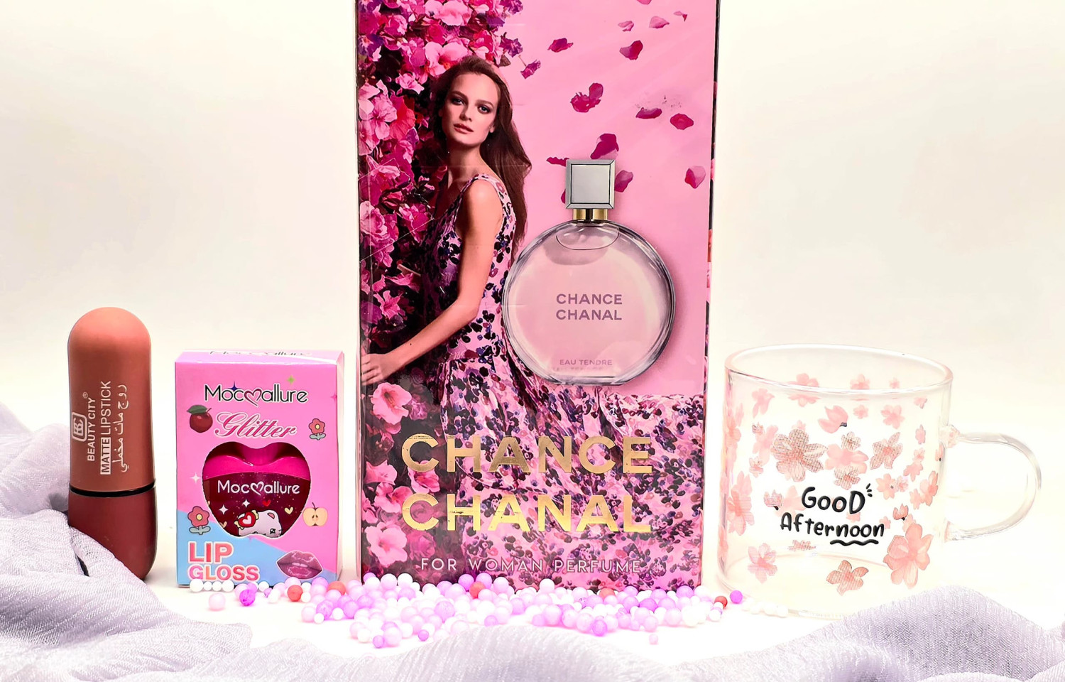 بكج نسائي ، المحتويات : بارفان مختوم 100 ml , شال فوج بينك , ماغ بايركس 8cm , روج نود , ليب غلوس كوري