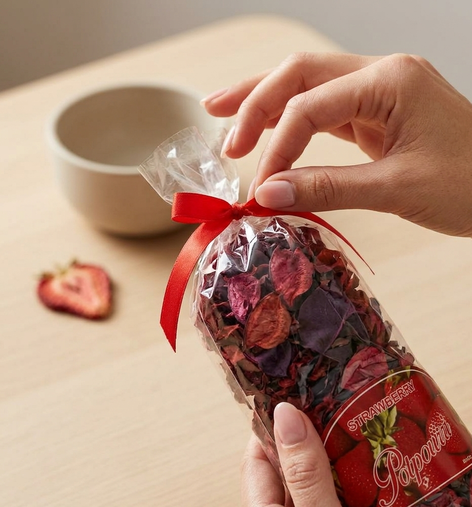 بتلات الورد المجففة تأتي في عبوة شفافة وتتميز بلونها الأحمر الغني. يتم استخدامها في صناعة البوتبورري (المعطرات الطبيعية) كزينة، بالإضافة إلى استخدامها في بعض الزخارف والديكورات المنزلية. يمكن أيضاً استخدامها في الطقوس العطرية أو إضافة لمسة طبيعية للمنزل. بتلات الورد المجففة عادة ما تكون ملونة أو مصبوغة لتحافظ على جمالها وملمسها لأطول فترة ممكنة.