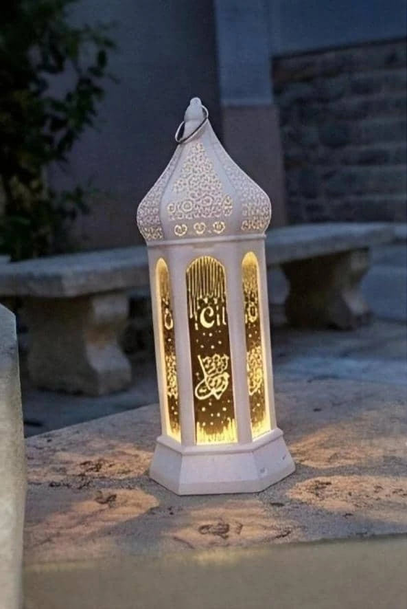 "فانوس رمضان" مزخرف. يتميز بتصميم تقليدي على شكل قبة مع أضواء داخلية تضفي تأثيرًا رائعًا. الفانوس مزخرف بزخارف هلالية ونجوم، ويحمل نقشًا مكتوبًا عليه "رمضان كريم" بالخط العربي. يعتبر هذا الفانوس من الزينة الرمضانية المميزة التي تضفي جواً روحانياً وجمالياً خلال شهر رمضان المبارك.