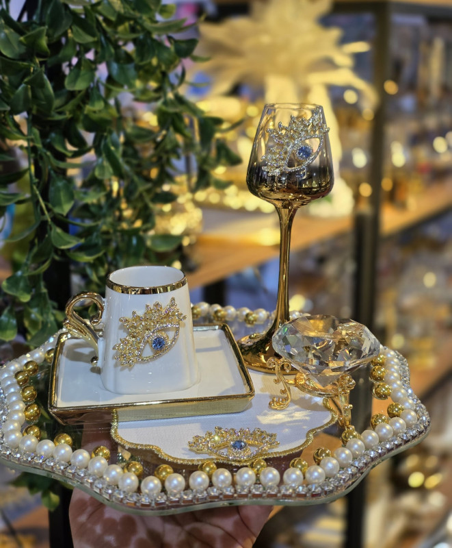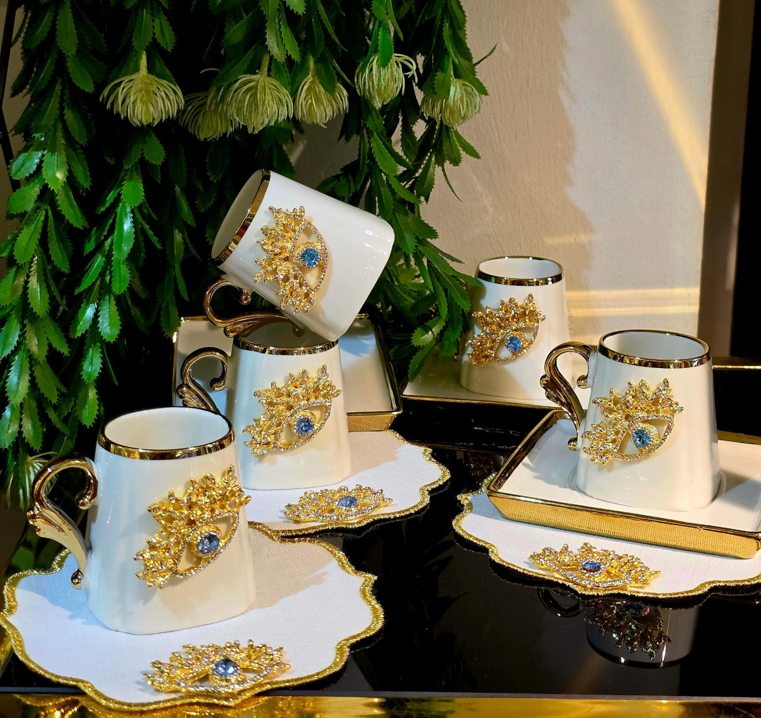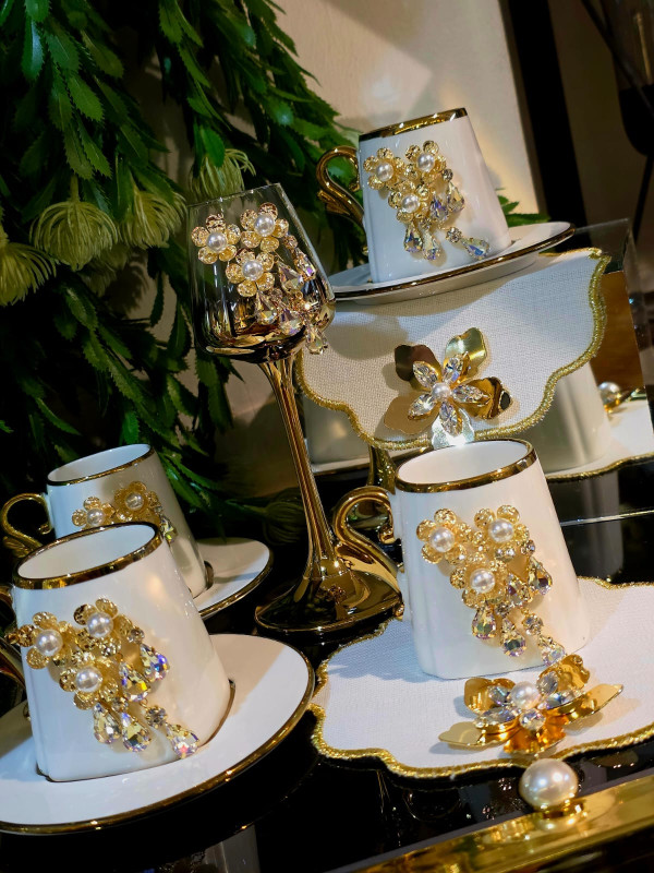 فناجين قهوة مميزين مزركشين بالزخارف وحجر الراين تواكب كل الاوقات