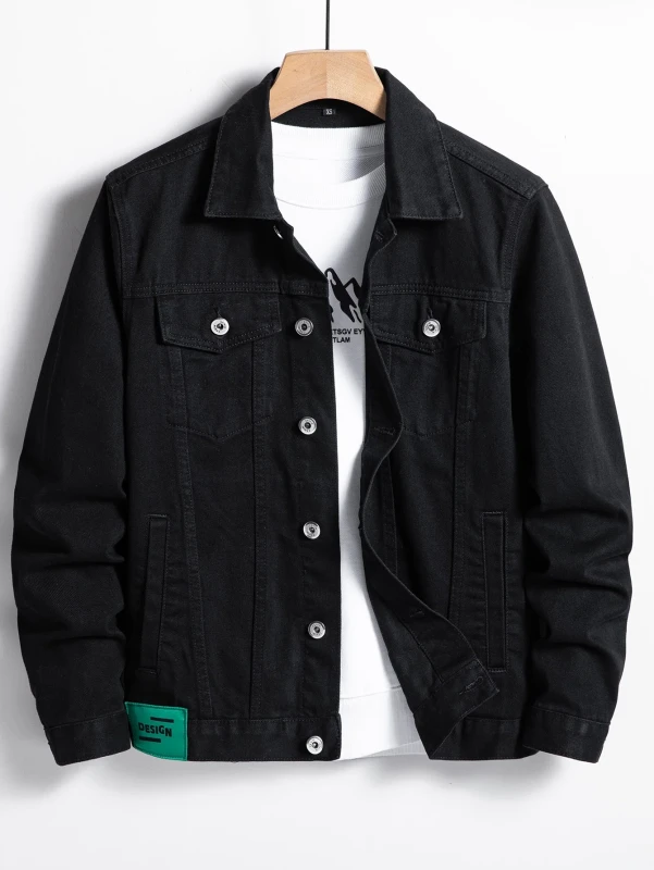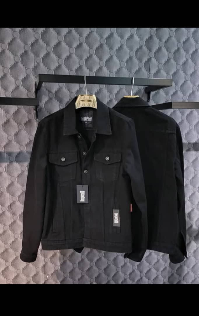المنتج المعروض في الصورة هو جاكيت جينز رجالي أسود وا رمادي كلاسيكي، ويتميز بالتفاصيل التالية