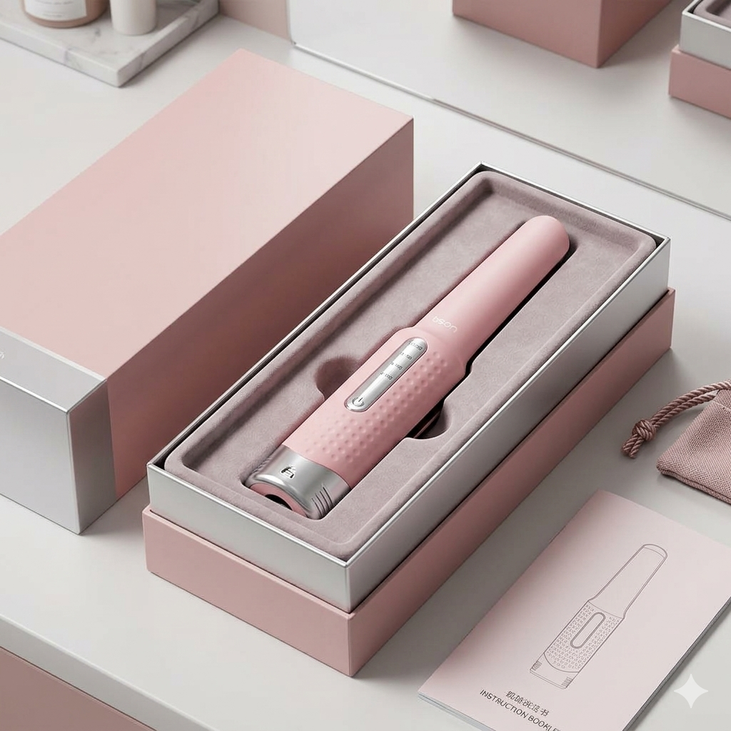 مكواة شعر صغيرة ومحمولة تعمل بدون سلك. قابلة للشحن وتناسب السفر أو الاستخدام السريع خارج المنزل. مصممة لفرد الشعر باستخدام ألواح تسخين داخلية. غالبًا تحتوي على بطارية مدمجة ومؤشرات لدرجة الشحن أو التشغيل.