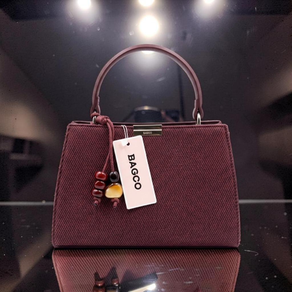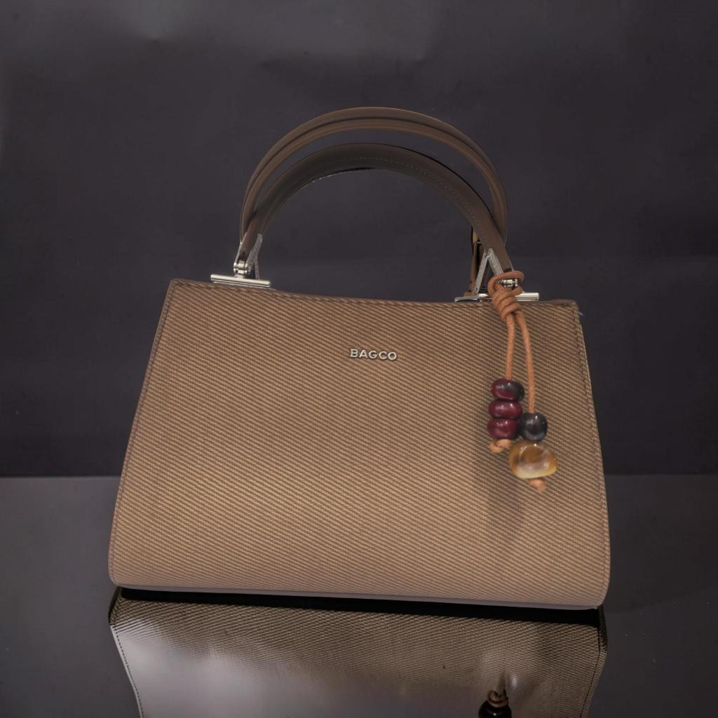حقائب باجو حقائب يد نسائية (Handbags) ذات تصميم كلاسيكي ومنظم (Structured)، تتميز بملمس قماشي بارز أو "مُحبب" يمنحها مظهراً عصرياً. الإضافات: تأتي الحقيبة مع دلاية زينة (Charm) مكونة من خرز ملون، مما يضيف لمسة جمالية فريدة للتصميم.