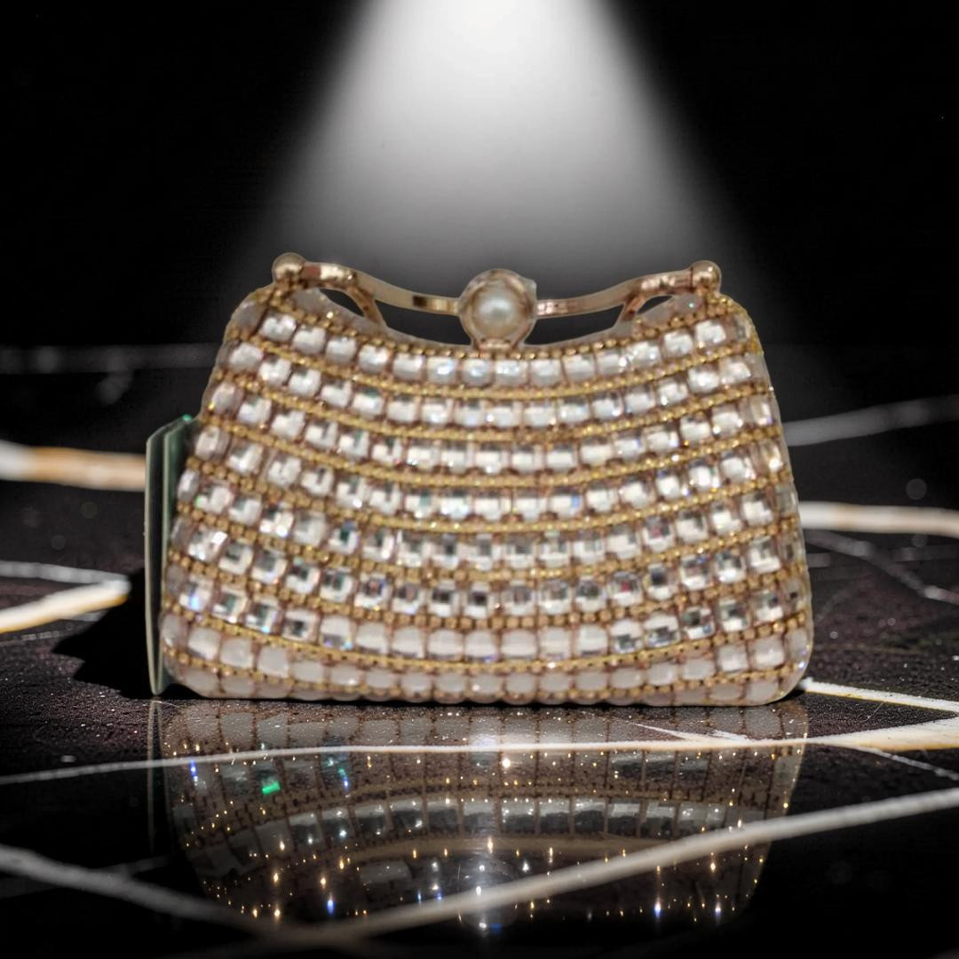 حقيبة سهرة نسائية (كلاتش) بتصميم فاخر وأنيق، مرصعة بالكامل بصفوف منتظمة من أحجار الكريستال اللامعة والخرز اللؤلؤي، وتتميز بإطار معدني ذهبي ومقبض علوي مزين بقطعة كروية تشبه اللؤلؤ، مما يجعلها قطعة مثالية لإضافة لمسة من البريق إلى فساتين المناسبات والأعراس.