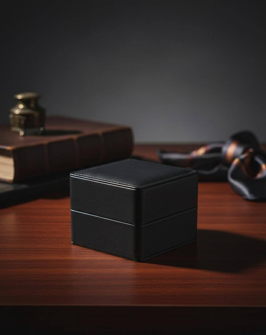 علبة هدايا سوداء فاخرة، جاهزة للإهداء.