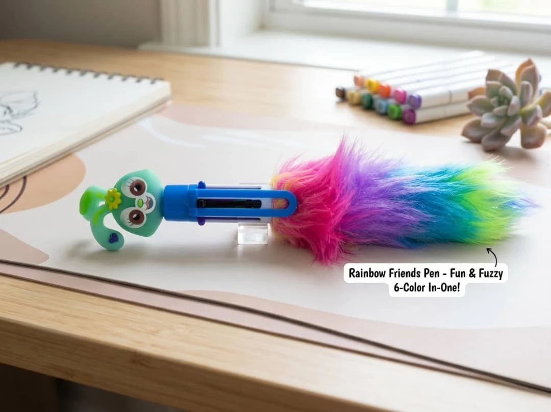 قلم ملوّن مزين برأس شخصية مرحة مع ذيل ملون مشابه لشعر مستعار. الرأس يحمل ملامح حيوان لطيف بعيون كبيرة وأذنين طافيتين، بينما ذيله مغطى بخصلات ملونة تتدرج من الألوان الزاهية مثل الوردي والأزرق والأخضر. هذا النوع من الأقلام غالباً ما يُصنع للأطفال كأداة ملونة وممتعة للاستخدام في المدرسة أو اللعب.