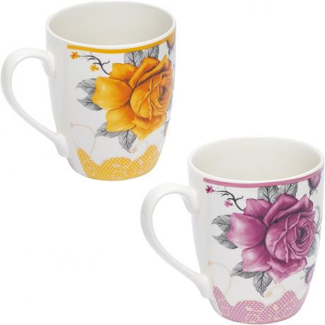 التصميم: تتميز الأكواب بتصميم أبيض أساسي مع مقابض، مزينة بأنماط زهور كبيرة ونابضة بالحياة.