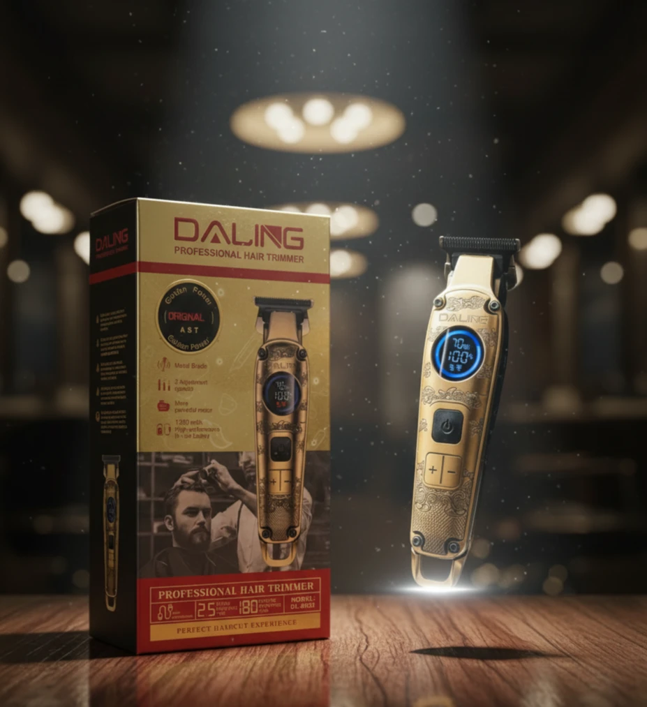 ماكينة حلاقة وتشذيب شعر ولحية احترافية من DALING، تتميز بتصميم أنيق بلون ذهبي وشاشة رقمية لعرض مستوى البطارية. تعمل بمحرك قوي مع إمكانية ضبط السرعة بثلاث مستويات، وتحتوي على بطارية ليثيوم بسعة 1200mAh تدوم حتى 180 دقيقة بعد شحن لمدة 2.5 ساعة. مناسبة للاستخدام المنزلي والصالونات، وتوفر حلاقة دقيقة وسلسة مع أداء عالي.