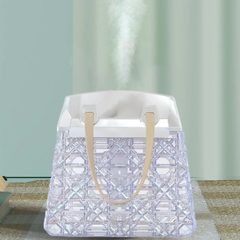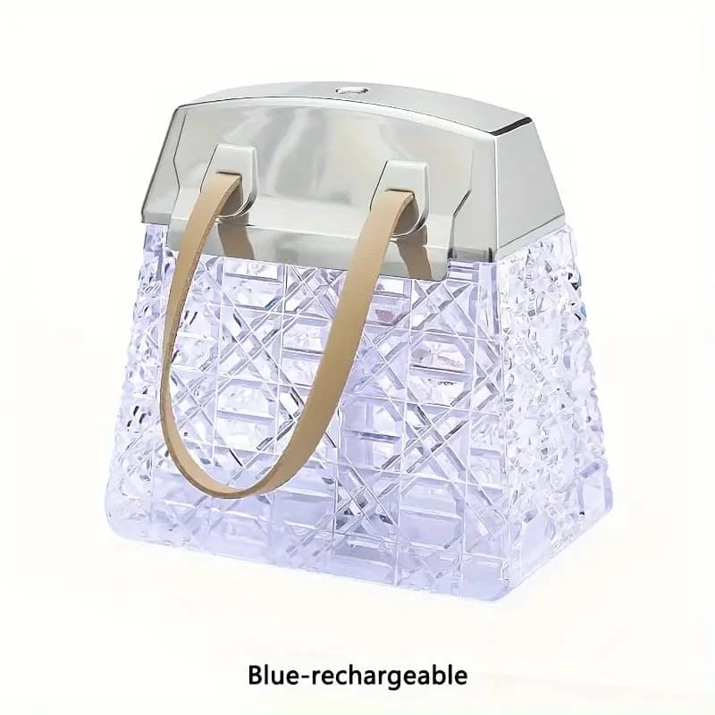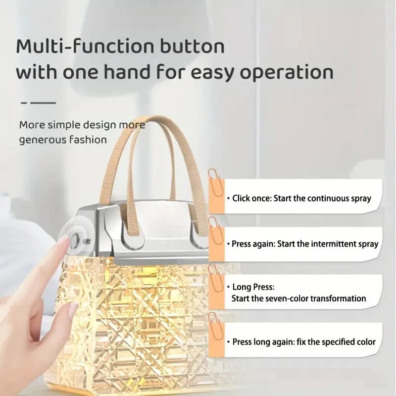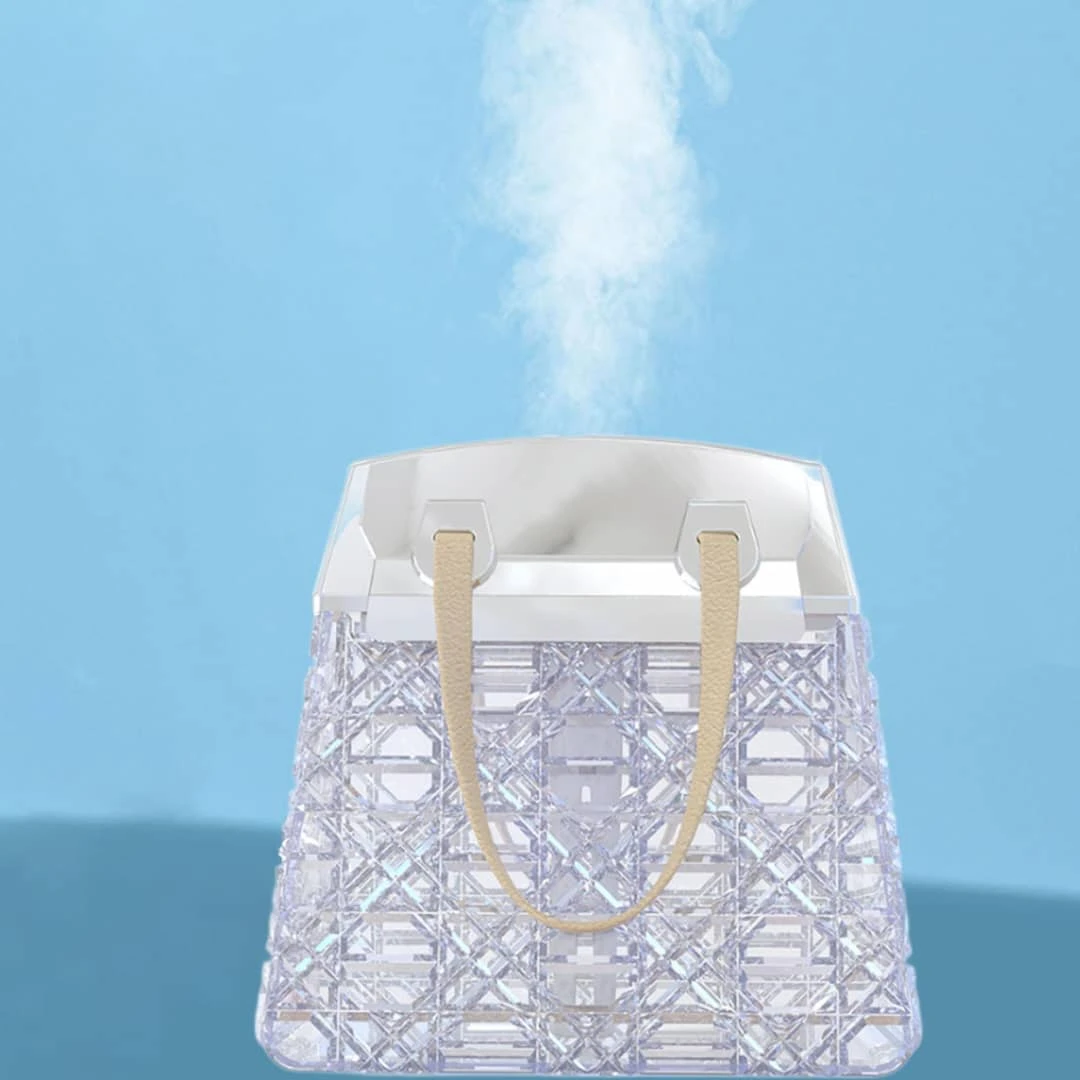 أضف لمسة من الفخامة والهدوء إلى أي مساحة مع هذا المصباح الفريد الذي يجمع بين التصميم العصري والوظائف المتعددة. يأتي على شكل حقيبة أنيقة بسطح شفاف مزخرف وغطاء معدني فاخر، ويعمل كمرطب هواء أو موزع عطر، مع إضاءة ناعمة قابلة للتغيير حسب المزاج.