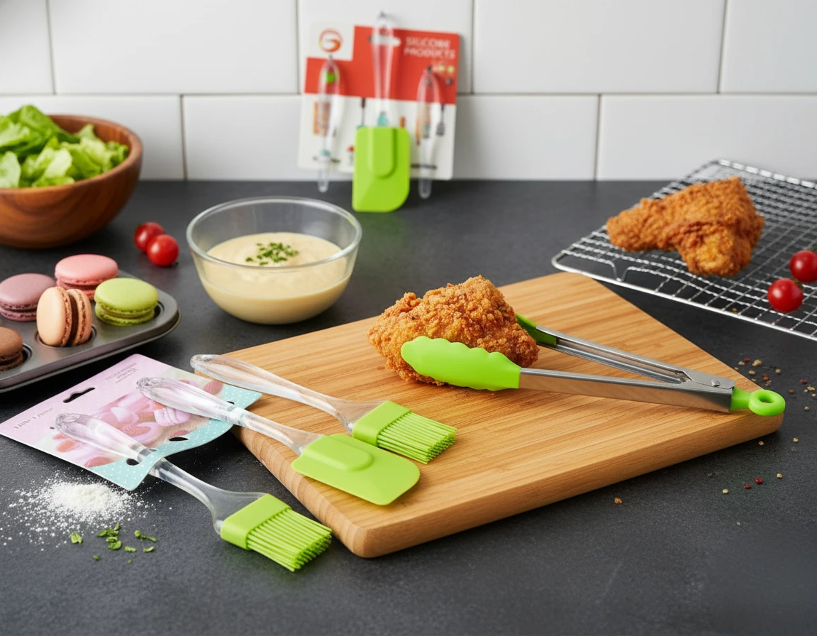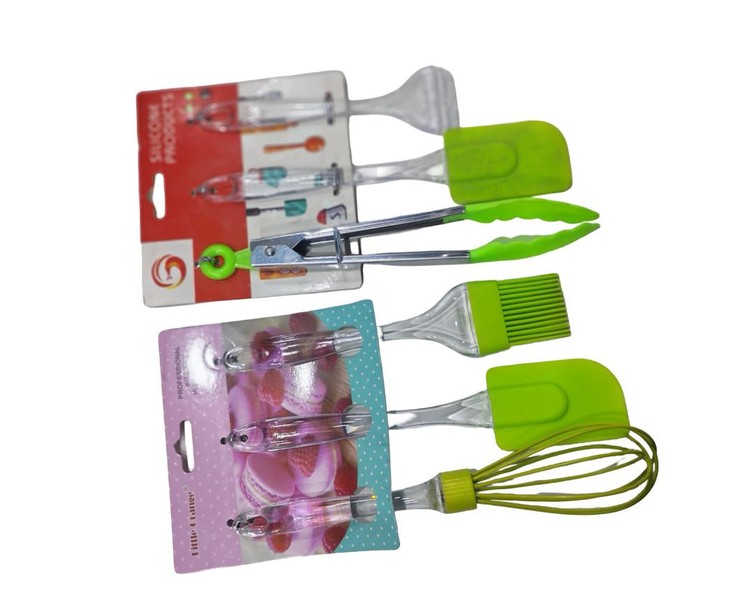 مجموعة أدوات مطبخ مصنوعة من السيليكون. تتضمن هذه المجموعة أدوات مختلفة مثل ملعقة خلط، ملقط، فرشاة للدهان، وسلك خفق، وهي مصممة لتسهيل العمل في المطبخ. تتميز هذه الأدوات بمقابض شفافه مع رأس سيليكون مرن يجعلها مثالية للاستخدام مع الأواني غير اللاصقة. تحتوي بعض الأدوات على رؤوس سيليكون بألوان مميزة مثل الأخضر. تأتي الأدوات مع عبوات عرض أنيقة تحتوي على صور توضيحية لتوضيح الاستخدام.