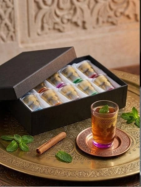 تتكون المجموعة من 12 كوبًا زجاجيًا، كل واحد منهم مزخرف بزخارف ذهبية جميلة. كل كوب يحتوي على لون مختلف في القاعدة، مما يضيف لمسة جمالية وفاخرة. الألوان تشمل الأزرق، البني، الوردي، الأحمر، الأخضر، وغيرها من الألوان الجذابة. هذه المجموعة تعتبر مثالية للاستخدام في المناسبات الخاصة أو كهدايا فاخرة.