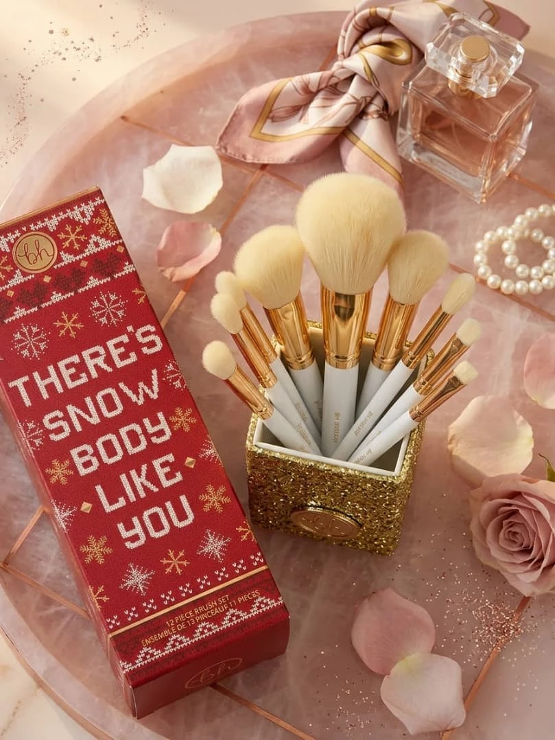 مجموعة فرش مكياج مكونة من 12 قطعة وتأتي مع عبوة لامعة ذهبية اللون. الفرش مصممة بعناية لتساعد في تطبيق المكياج بدقة. تحتوي المجموعة على فرش متنوعة تشمل فرش للوجه، العيون، وأيضاً فرش للمسات التفصيلية. العبوة مغلفة بتصميم احتفالي شتوي مع عبارة "THERE'S SNOW BODY LIKE YOU" التي تضيف لمسة من المرح والأنوثة للمجموعة.