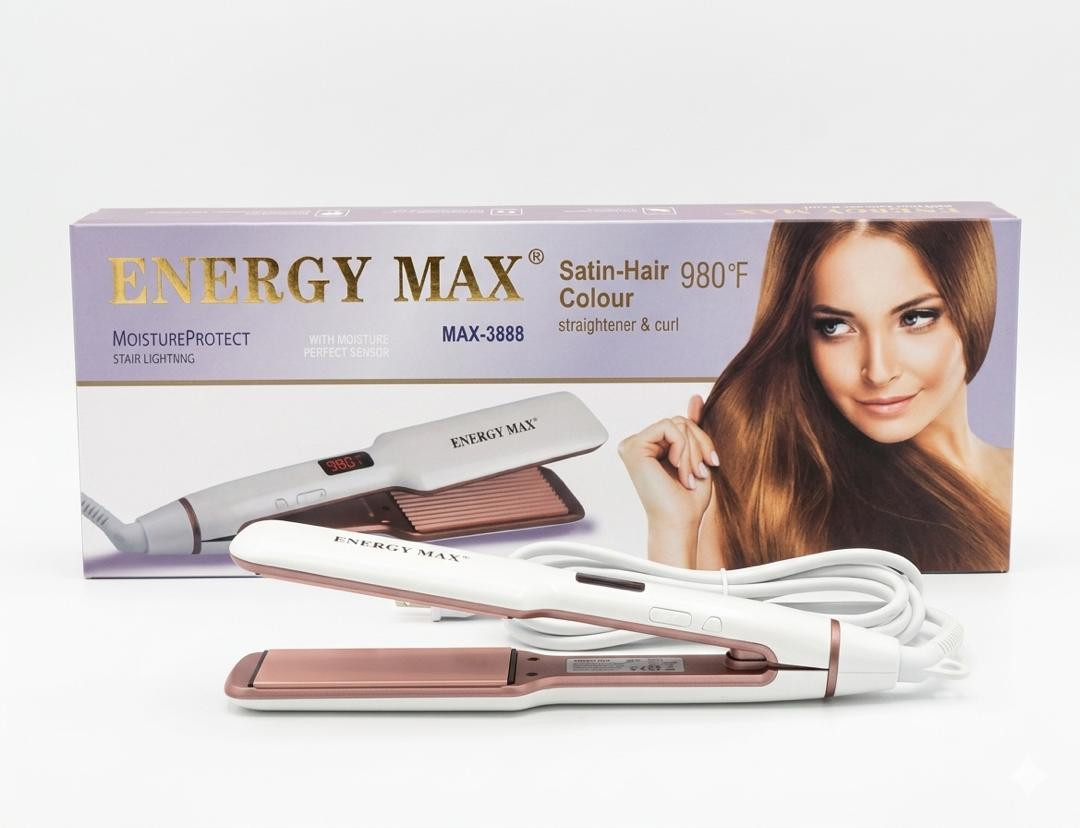 مكواة شعر من ENERGY MAX مخصصة لفرد الشعر وعمل التمويج (Straightener & Curl). تتميز بتقنية Moisture Protect للمساعدة في الحفاظ على رطوبة الشعر وتقليل التلف الناتج عن الحرارة. تصل درجة حرارتها القصوى إلى 980°F، مع ألواح مصممة لتوزيع الحرارة بشكل متساوٍ، ما يساعد على فرد الشعر بسرعة أو تشكيل تموجات ناعمة. تصميم أنيق وسهل الاستخدام، مناسب للاستخدام المنزلي اليومي.