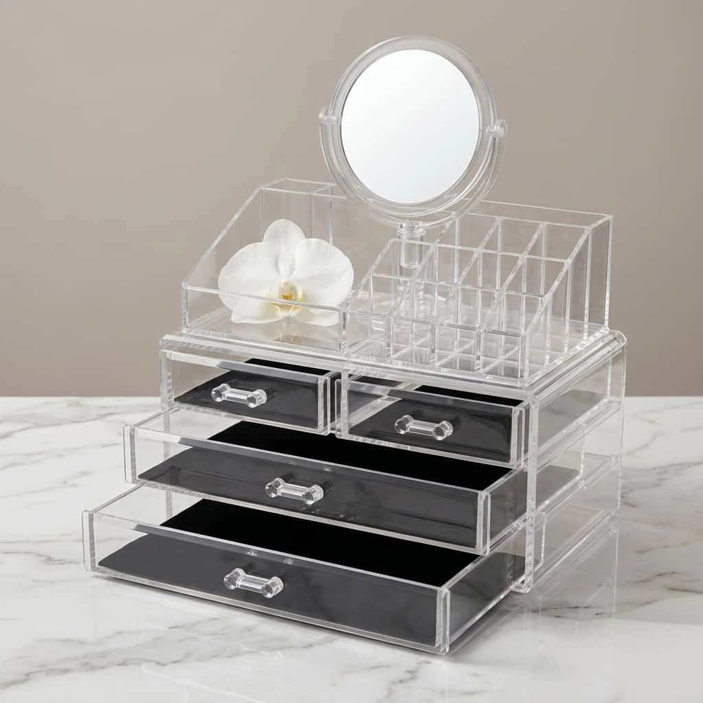 منظم تجميل متعدد الاستخدامات مصنوع من الأكريليك الشفاف، يحتوي على عدة أدراج ومساحات مفتوحة لوضع أدوات المكياج والعناية بالبشرة مثل أحمر الشفاه، المسكرة، فرش المكياج، وأدوات التجميل الأخرى. يأتي مزودًا بمرآة صغيرة قابلة للتدوير لتسهيل وضع المكياج. يناسب وضعه على منضدة الزينة أو المكتب لتنظيم مستحضرات التجميل بشكل مرتب وواضح.