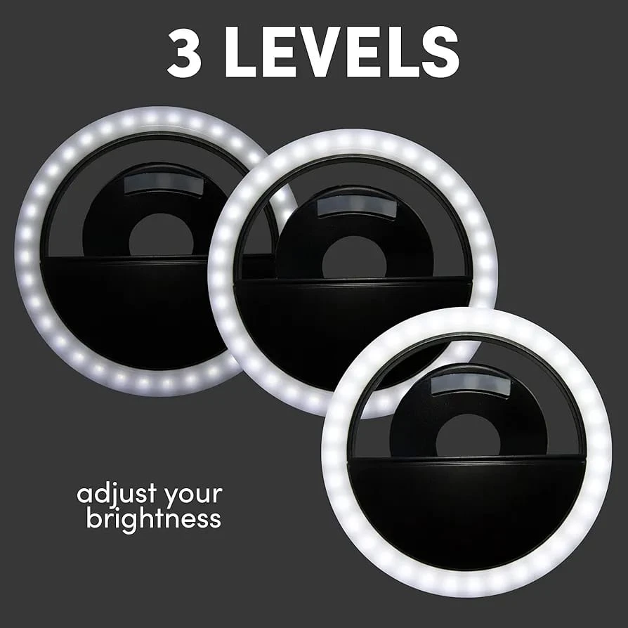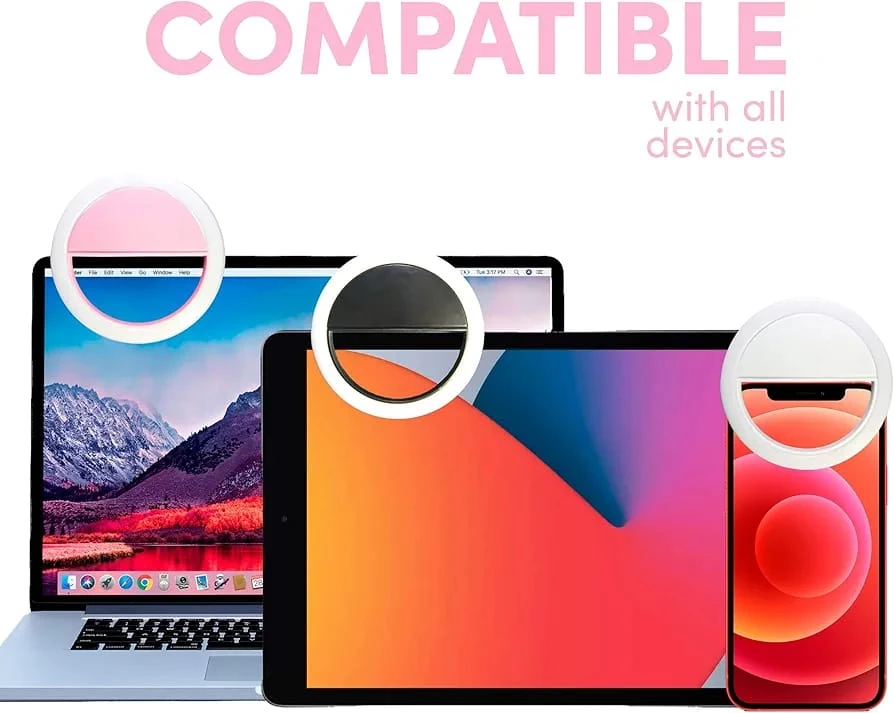 مصابيح السيلفي الدائرية المحمولة بتقنية LED. هذه الأجهزة مصممة لتثبيتها بمشبك على الهواتف الذكية أو الأجهزة اللوحية أو أجهزة اللاب توب لتوفير إضاءة إضافية عند التقاط صور السيلفي أو تسجيل مقاطع الفيديو أو إجراء مكالمات الفيديو.