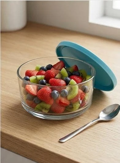 وعاء عملي مصنوع من زجاج شفاف عالي الجودة مع غطاء سيليكون مرن باللون الأزرق، يوفر إغلاقًا محكمًا للحفاظ على نضارة الطعام ومنع التسرب. مناسب لتخزين بقايا الطعام، الفواكه، والوجبات الجاهزة في الثلاجة أو أثناء التنقل. سهل التنظيف، آمن للاستخدام اليومي، ويتميز بتصميم أنيق ومتين
