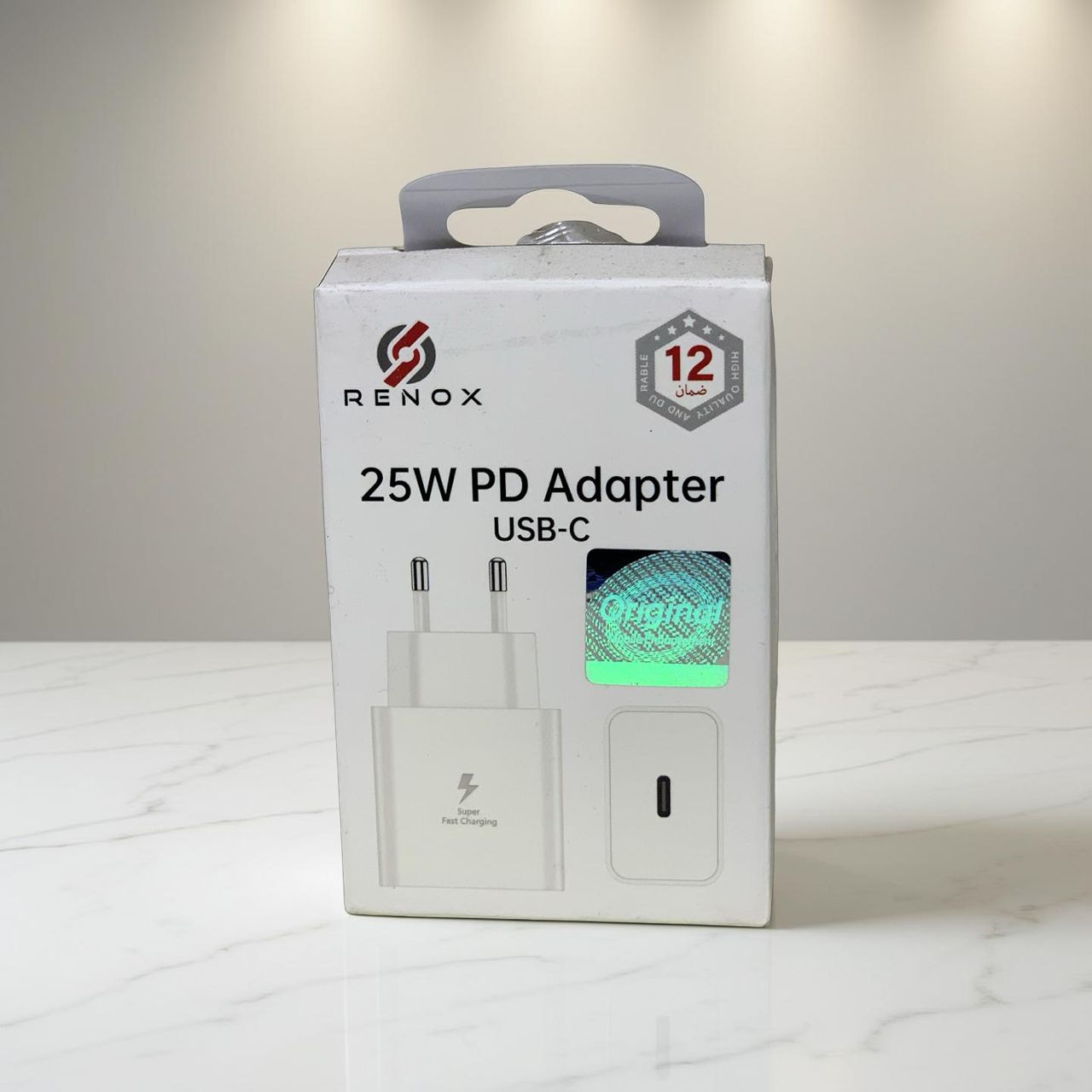 شاحن حائط من شركة RENOX يدعم تقنية الشحن السريع Power Delivery (PD) بقدرة تصل إلى 25 واط، مزود بمنفذ USB-C لتوفير شحن سريع وآمن للهواتف الذكية والأجهزة اللوحية وغيرها من الأجهزة المتوافقة. يتميز بتصميم مدمج وخفيف الوزن، مع نظام حماية مدمج ضد زيادة التيار والحرارة، مما يجعله مناسبًا للاستخدام اليومي في المنزل أو أثناء السفر. حاصل على علامة جودة لضمان الأداء والموثوقية.