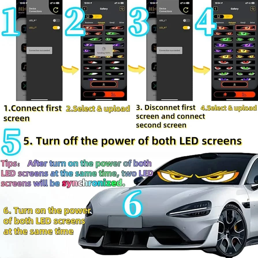 الألوان والأنماط: تدعم الألواح ألوان RGB كاملة ويمكن برمجتها عبر تطبيق الهاتف المحمول لعرض أنماط مختلفة مثل العيون الخضراء والحمراء والصفراء والزرقاء الموضحة في الجزء السفلي من الصورة، بالإضافة إلى النصوص المتحركة والكتابة على الجدران.