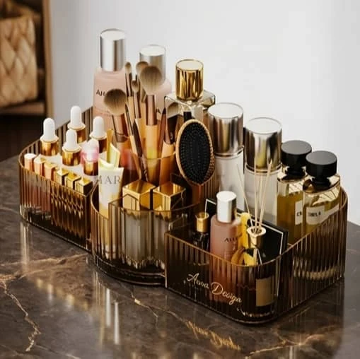 تخزين مرتب باستخدام شبكة تقسيم لاحتواء مستحضرات التجميل بشكل منظم ومرتب.