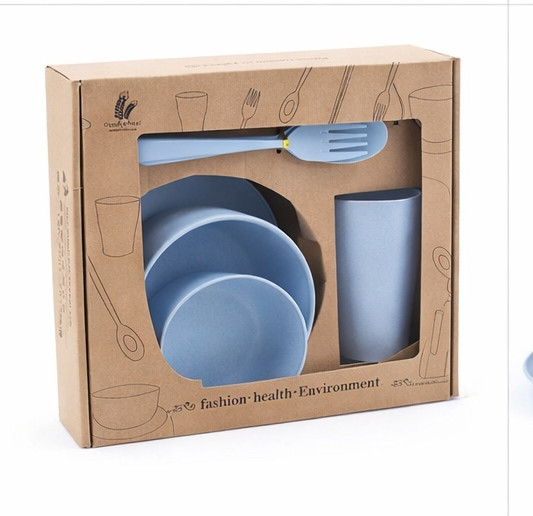 يأتي الطقم داخل علبة كرتونية أنيقة ذات تصميم بسيط يعكس الطابع البيئي للمنتج، ما يجعله مناسبًا أيضًا كهدية. اللون الأزرق يعطي إحساسًا بالنظافة والهدوء، ويتناسق مع مختلف ديكورات المطبخ أو الرحلات الخارجية.