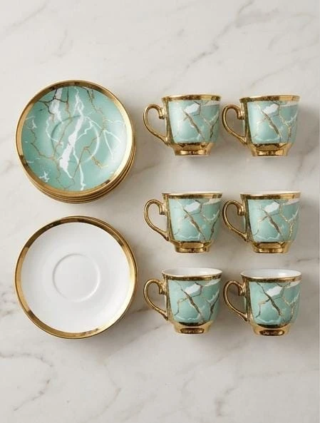ليوفر لك تجربة شاي أو قهوة استثنائية. يتضمن هذا الطقم 6 أكواب مع 6 صحون صغيرة، جميعها مزينة بتصميم عصري من خطوط ذهبية لامعة على قاعدة بلون أخضر هادئ، ما يجعله خيارًا مثاليًا للمناسبات الخاصة أو لتزيين طاولتك في كل يوم.