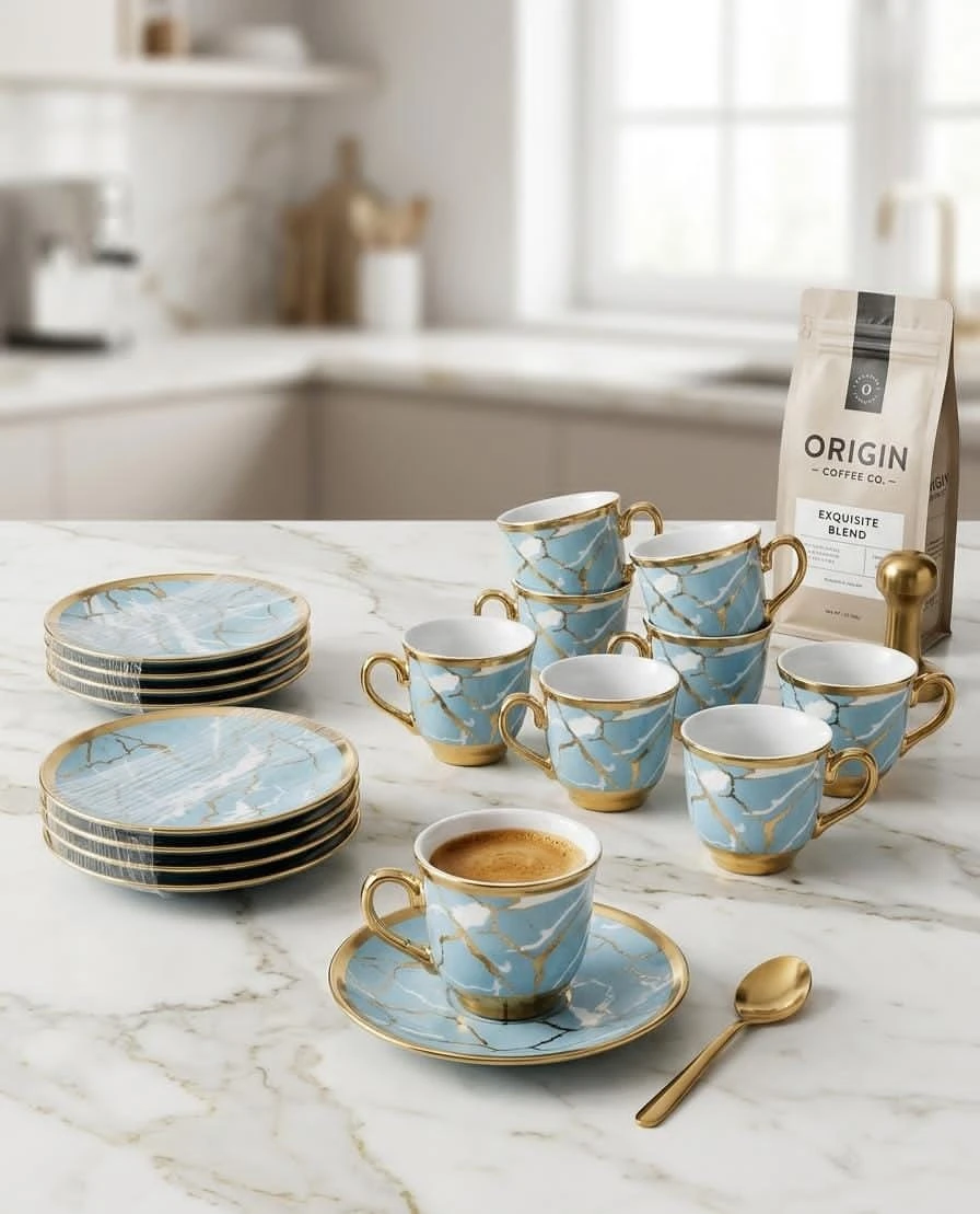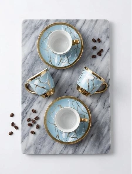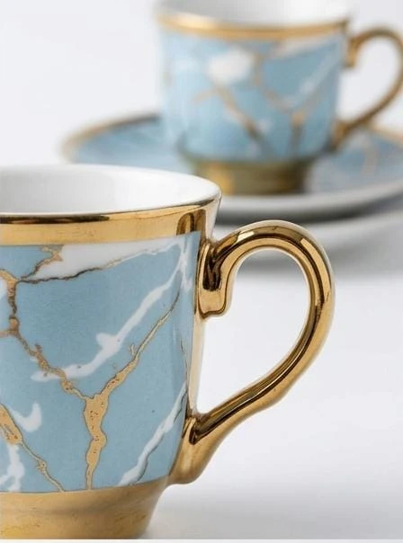 اللمسة الذهبية المتناغمة مع اللون الأزرق تخلق مزيجًا من الأناقة التي تجعل كل تناول للمشروب تجربة مميزة. مصنوع من أجود أنواع الخزف، مما يضمن لك طقمًا متينًا وآمنًا للاستخدام اليومي أو كهدية فاخرة لأحبائك.