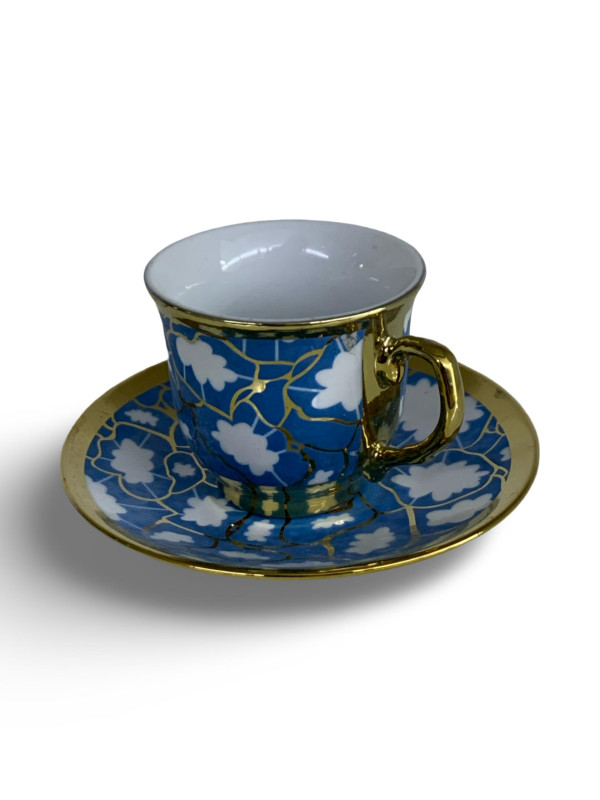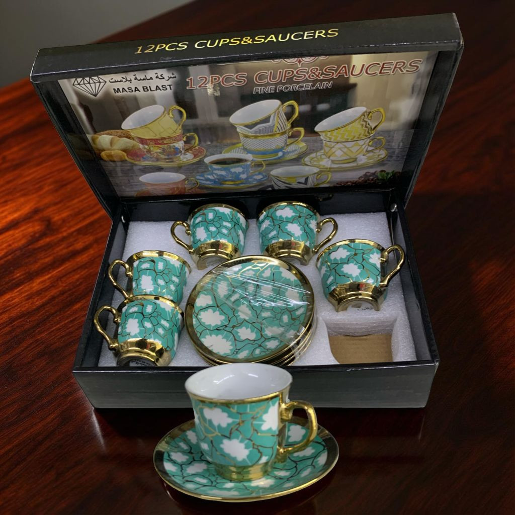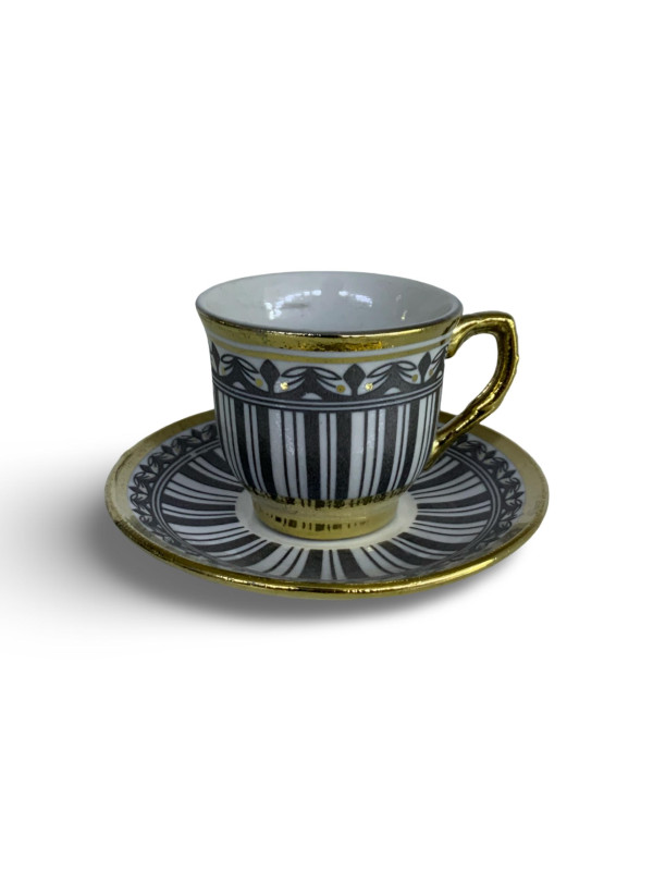 طقم أنيق مكوّن من 6 فناجين قهوة و6 صحون، مصنوع من البورسلان عالي الجودة، بتصميم فاخر يجمع بين اللون الأسود والنقوش الذهبية الراقية. يتميز بمظهره الكلاسيكي الجذاب الذي يضفي لمسة فخامة على جلسات القهوة والضيافة.
