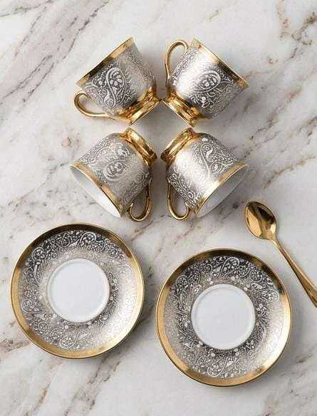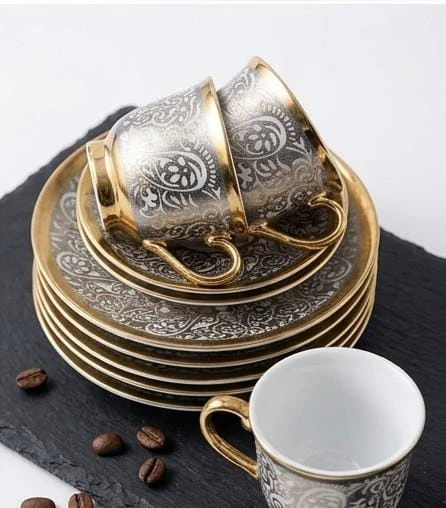 استمتع بتجربة شرب القهوة بطريقة راقية مع طقم الفناجين الفاخر المكون من 12 قطعة، الذي يأتي بتصميم مميز من النقوش الذهبية الرائعة على قاعدة بيضاء لامعة. يضم الطقم 6 فناجين و6 صحون بحواف ذهبية أنيقة، مما يضفي لمسة من الفخامة والجمال على طاولتك.