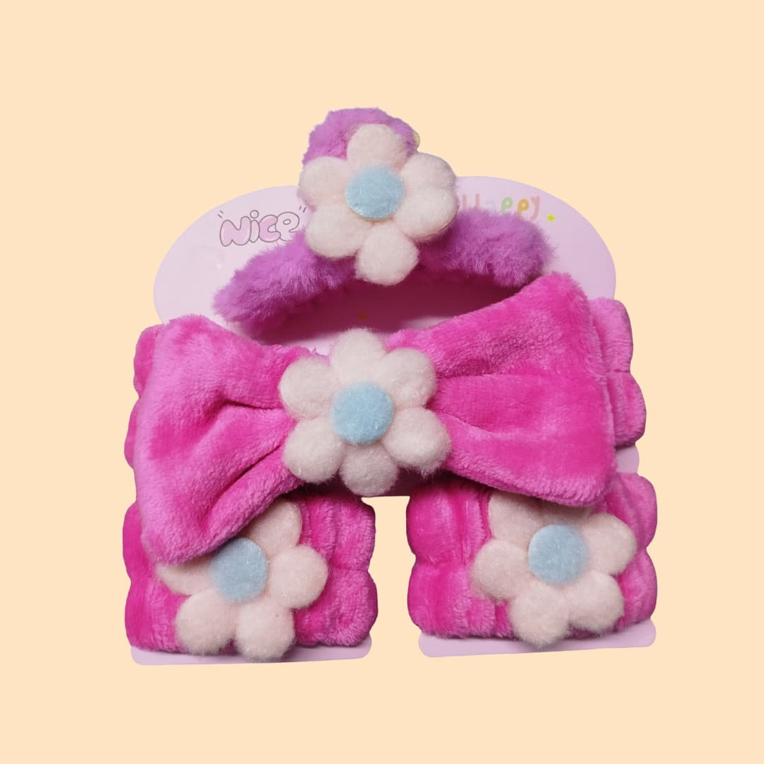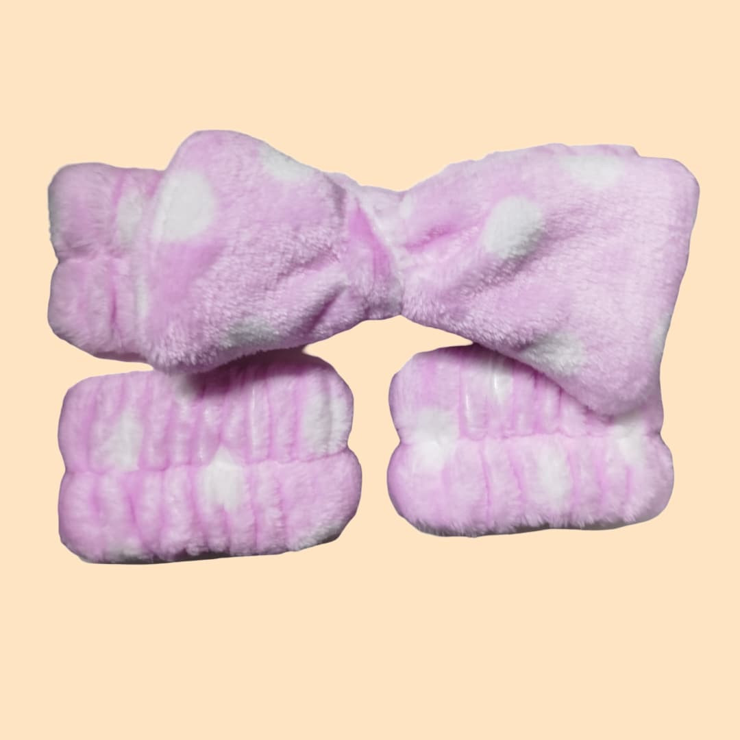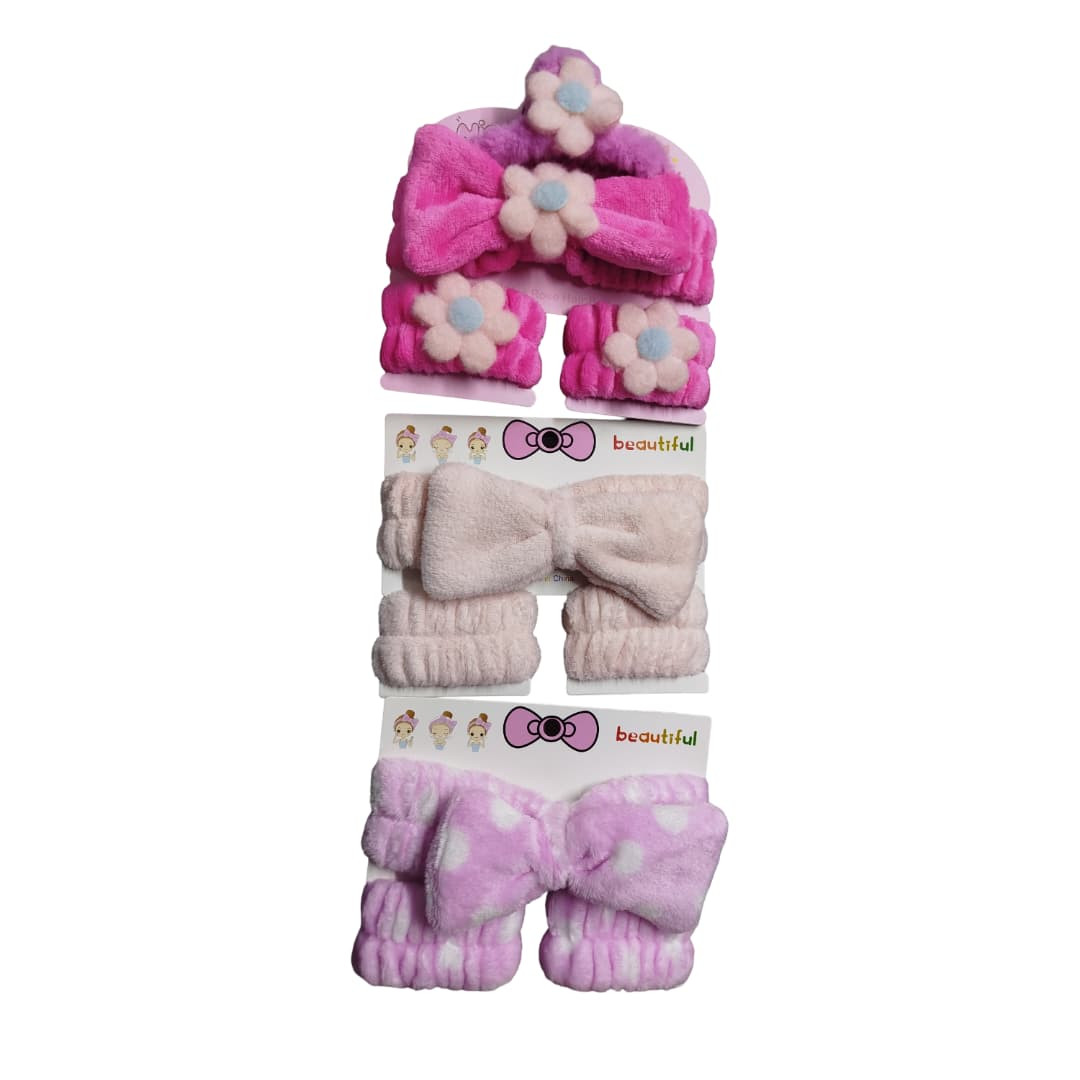طقم عملي وأنيق مخصص للعناية بالبشرة والمكياج، يتكوّن من رباط رأس ناعم مزخرف بفيونكة أو زهور، بالإضافة إلى زوج من أربطة المعصم لامتصاص الماء. مصنوع من قماش مخملي فائق النعومة ومريح على البشرة، يساعد على تثبيت الشعر بعيدًا عن الوجه أثناء غسل الوجه، وضع المكياج، أو تطبيق الماسكات