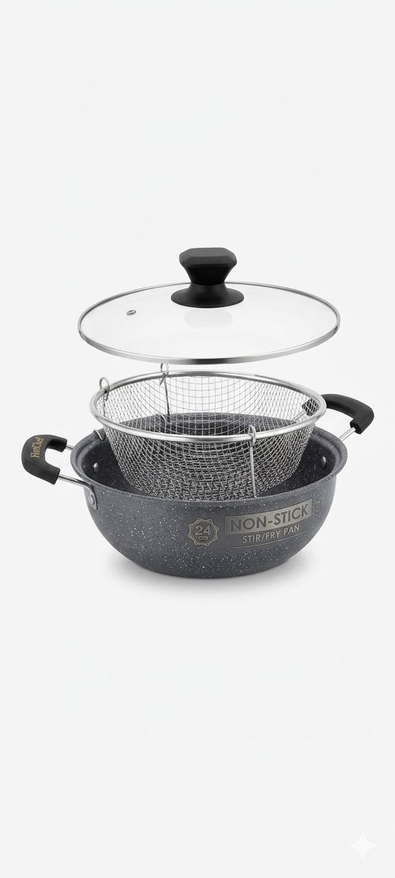 مقلاة متعددة الاستخدامات من HotChef، مصنوعة بطبقة غير لاصقة عالية الجودة لتسهيل الطهي والتنظيف. تأتي مع سلة شبكية للقلي وغطاء زجاجي مقاوم للحرارة لمراقبة الطعام أثناء الطهي. مناسبة للقلي، التشويح (Stir Fry)، وتحضير مختلف الأطباق، وتتميز بمقابض مريحة وآمنة للاستخدام اليومي في المطبخ.